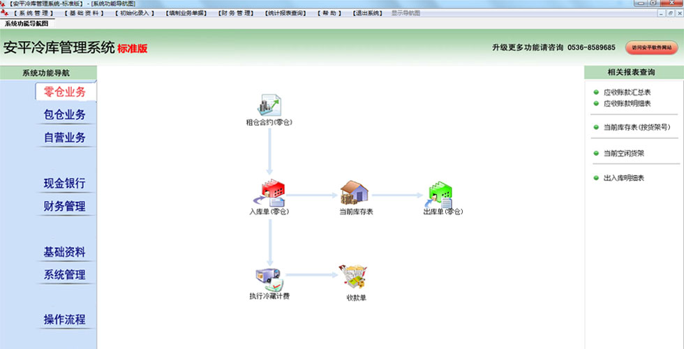 安平冷库管理软件支持单机、网络、云计算版,界面设计简洁方便,功能强大,集零仓、包仓、自营业务于一体化管理,适合冷库租赁及自营业务的企业。